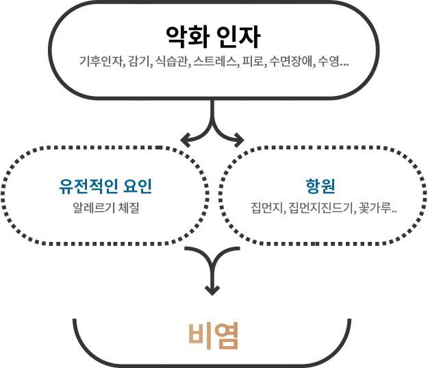 비염은 기존의 이론에 의하면 부모로부터의 유전, 각종 항원, 악화인자(기후인자, 공기 오염, 새집증후군, 일교차, 지나친 냉방 등) 이 세 가지를 주요 원인으로 꼽았습니다.